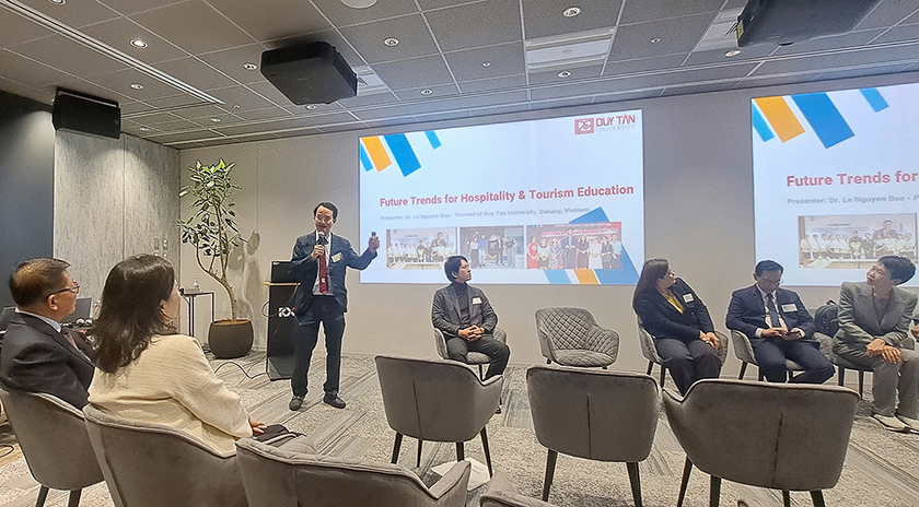 Trong khuôn khổ sự kiện, TS. Lê Nguyên Bảo, Giám đốc ĐH Duy Tân đã tham gia với tư cách diễn giả và thành viên lãnh đạo học thuật khu vực, trình bày những phân tích chiến lược về xu hướng phát triển Giáo dục Du lịch - Khách sạn trong kỷ nguyên AI, đồng thời chia sẻ kinh nghiệm từ thực tiễn đổi mới đào tạo đi kèm AI tại Việt Nam.